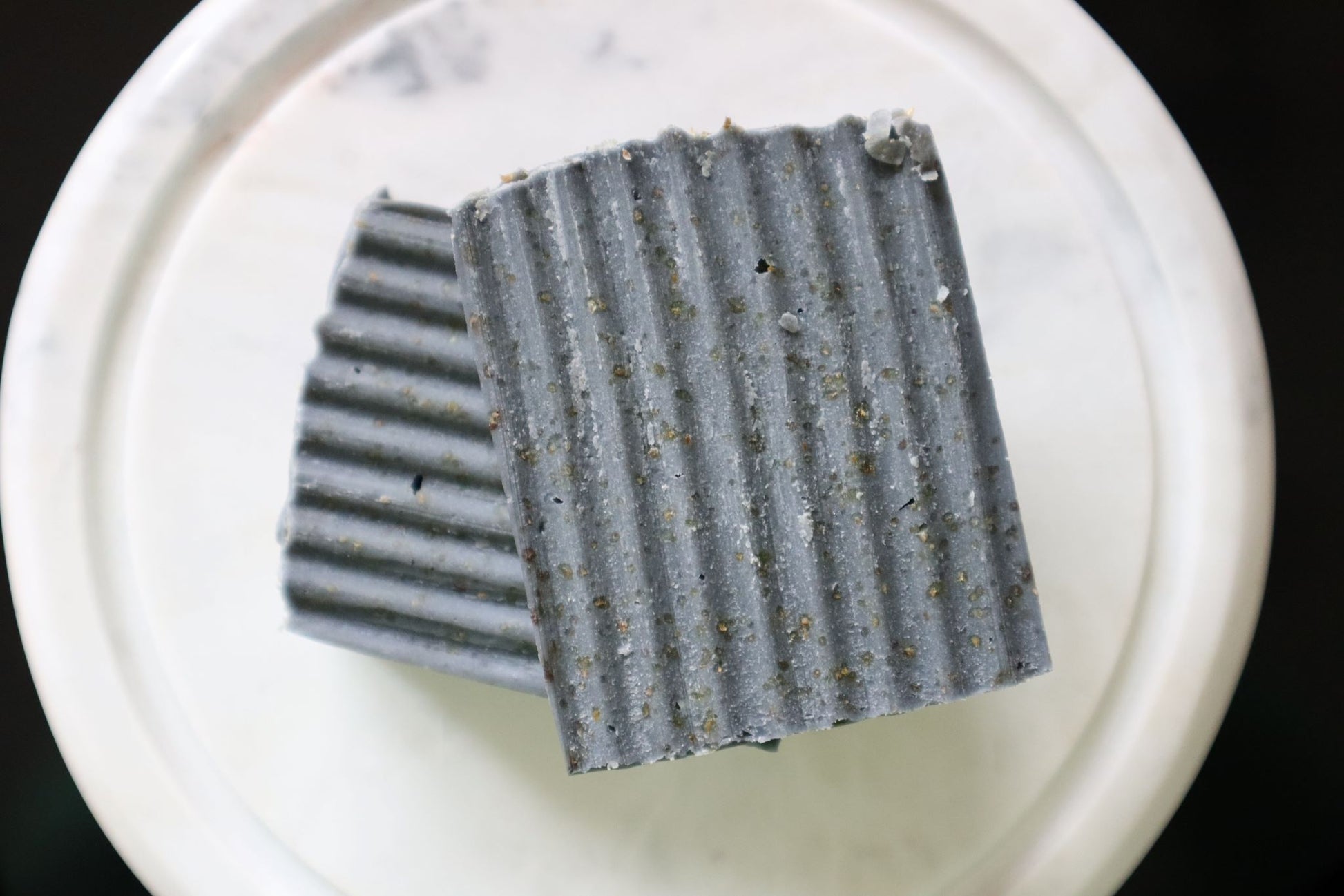 Soap created with a mix of olive oil, shea butter, coconut oil, palm oil, castor oil, fresh cut rosemary, rosemary essential oil and activated charcoal.